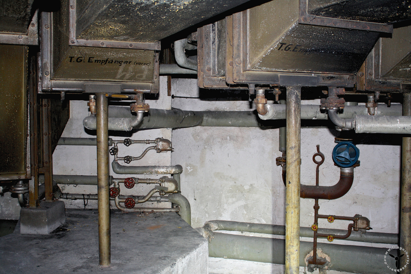 Die folgenden Bilder (Abb.4a-4d) zeigen den unterirdischen Betriebsraum, der beim Umbau zur Empfangsstelle links vor dem Hangar errichtet wurde und mit denen zur Kühlung der Empfänger notwendigen Geräten ausgestattet war.