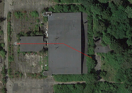 Die rote Linie markiert in etwa den Verlauf des Gangs, der unter Hangar #4 hindurchführt. Am Anfang der roten Linie links, sieht man grau den Betonverschluss über dem ehemaligen Einstieg. In Abb.5c sieht man diesen Bereich mit der Einstiegsleiter an der Wand von unten.