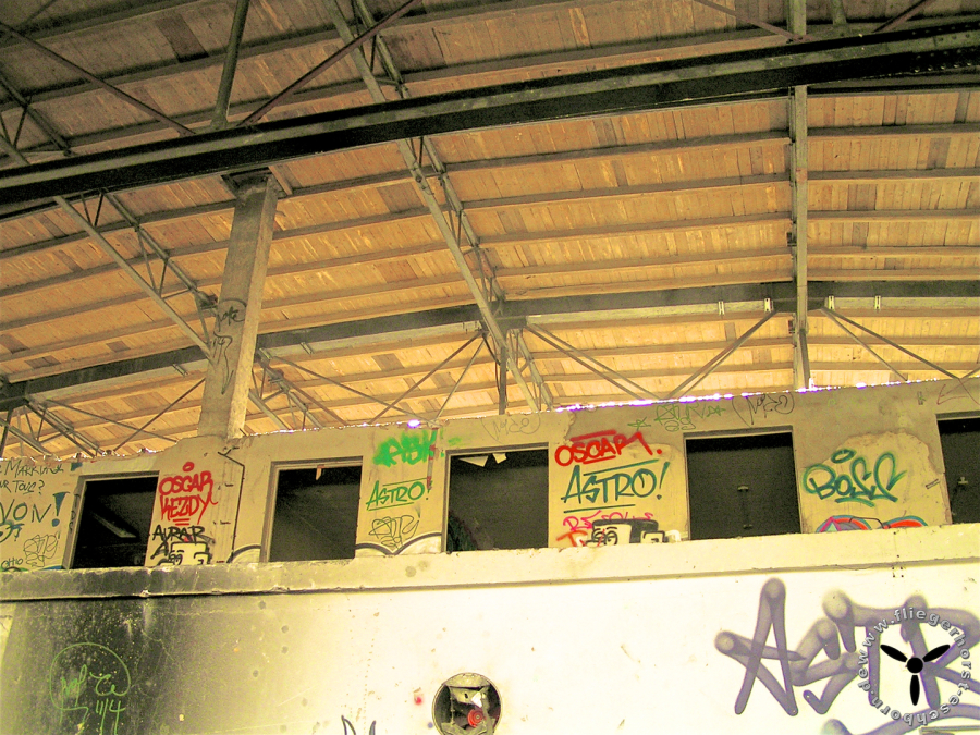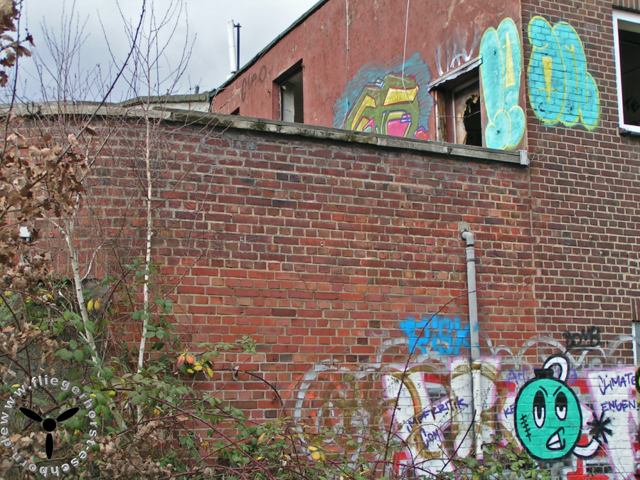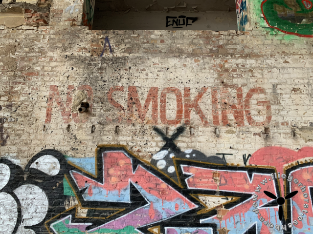 Abb.16: Die Abbildung zeigt oberhalb von der Graffity, den aufgemalten Schriftzug "NO SMOKING". Er kam erst nach dem Abriss der Büroräume im vorderen Bereich des Hangars wieder zum Vorschein.