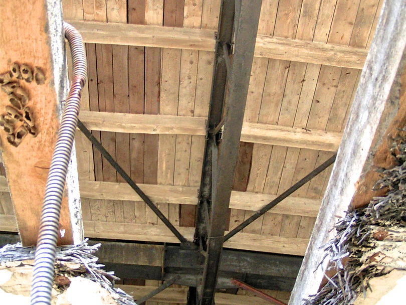 Überall auf dem Boden findet man heute nur noch die Reste vom Installationsmaterial und Isolierungen der Kabel. Auch hier sind die Kabel entwendet worden. Die Abbildung 5d zeigt den Zugang vom Hangar in den Kabelschacht. Er befand sich am Boden, etwas versteckt in einem kleinen Raum, hinter einem der Büroräume.