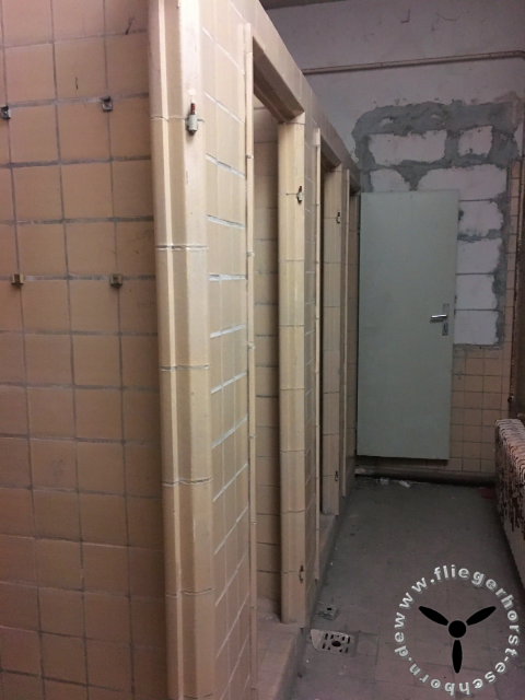 Im östlichen Flügel befinden sich eine Reihe von alten Sanitäranlagen. Sie waren von der Flugzeughalle aus gut erreichbar, auch wenn sich nicht alle Einbauten schon zu Kriegszeiten in dem Hangar befunden haben.
